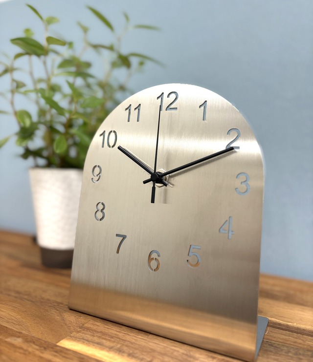 シンプルでスタイリッシュなデザインが美しい置き時計。 ステンレスが醸し出す風合いでスタイリッシュな空間を創り出します。 光が当たる角度により色々な表情を映し出します。 インテリアとして邪魔をしない…けどモダンな雰囲気を表現します。 お好みの針とデザインで自分だけの心落ち着かせる空間を創り出しませんか。 【内容量】時計1個(ムーブメント付)・時計針一式・ムーブメント取付工具一式・取扱説明書・単3電池1個 ※配送中の針の破損を防ぐため針は別梱包にて発送いたします。開封後、説明書の通りにご自身で取付、設定をお願いします。 【サイズ】:高さ:18.5cm 幅:15cm 奥行:7cm 商品重量:約600g 【材質】ステンレス 【仕様】ムーブメント:SKPクォーツムーブメント 時計針:白ストレート ※電波時計ではありません ※丁寧に養生し60サイズ段ボールにて発送いたします ※直接素手で触ると後が付きやすいためご注意ください ※汚れがついてしまった場合はアルコール等でふき取りしてください ※針はとても繊細ですので取扱いにご注意ください